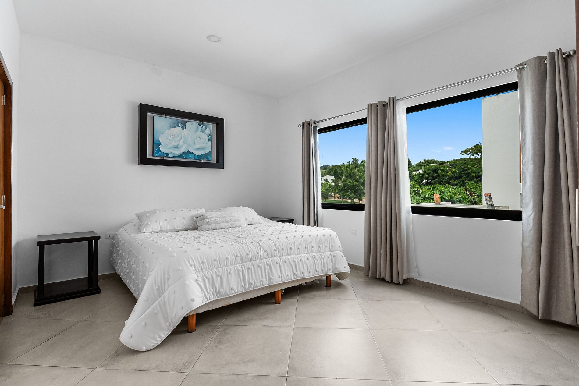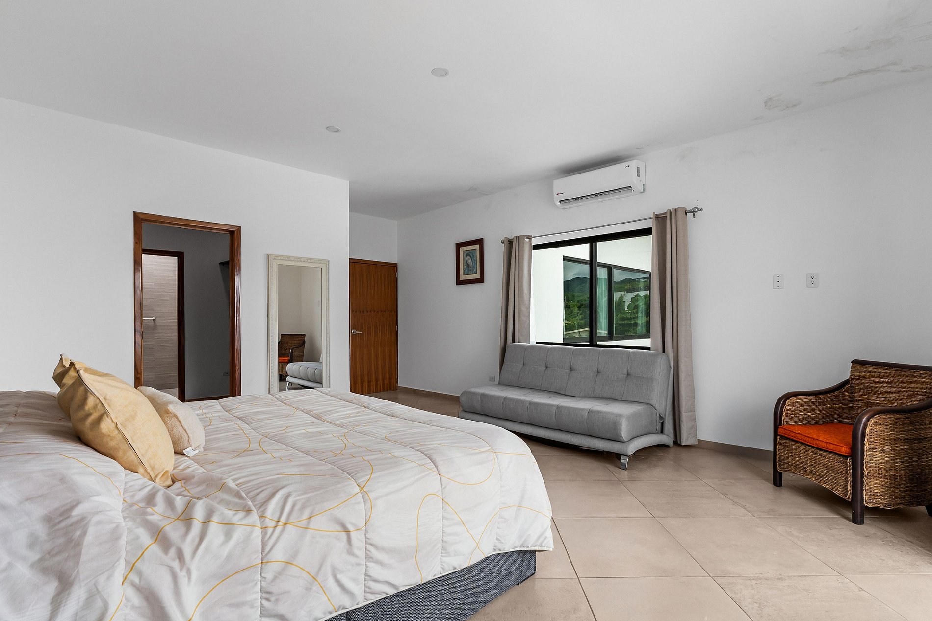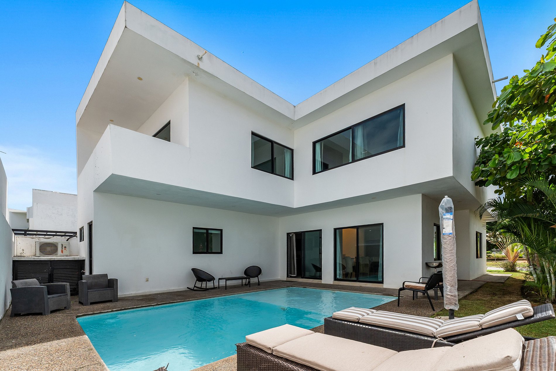Welcome to Casa Oasis, your tropical escape in the secure, gated community of B-Nayar. This stylishly decorated villa features 4 bedrooms: a spacious primary suite with a 2 double beds and a sofa bed, second bedroom with a full-size bed and a sofa bed, third room with a king size bed, and a 4th room in the first floor with a twin bed. The upstairs living room also includes 2 comfortable sofa beds—perfect for extra guests. Every room has its own full bathroom. The open-plan living/dining area are fully air-conditioned with mini-split units for year-round comfort. There is a powder room as soon as you com in the villa as well as a bathroom next to the pool no need to go into the house when your having fun.