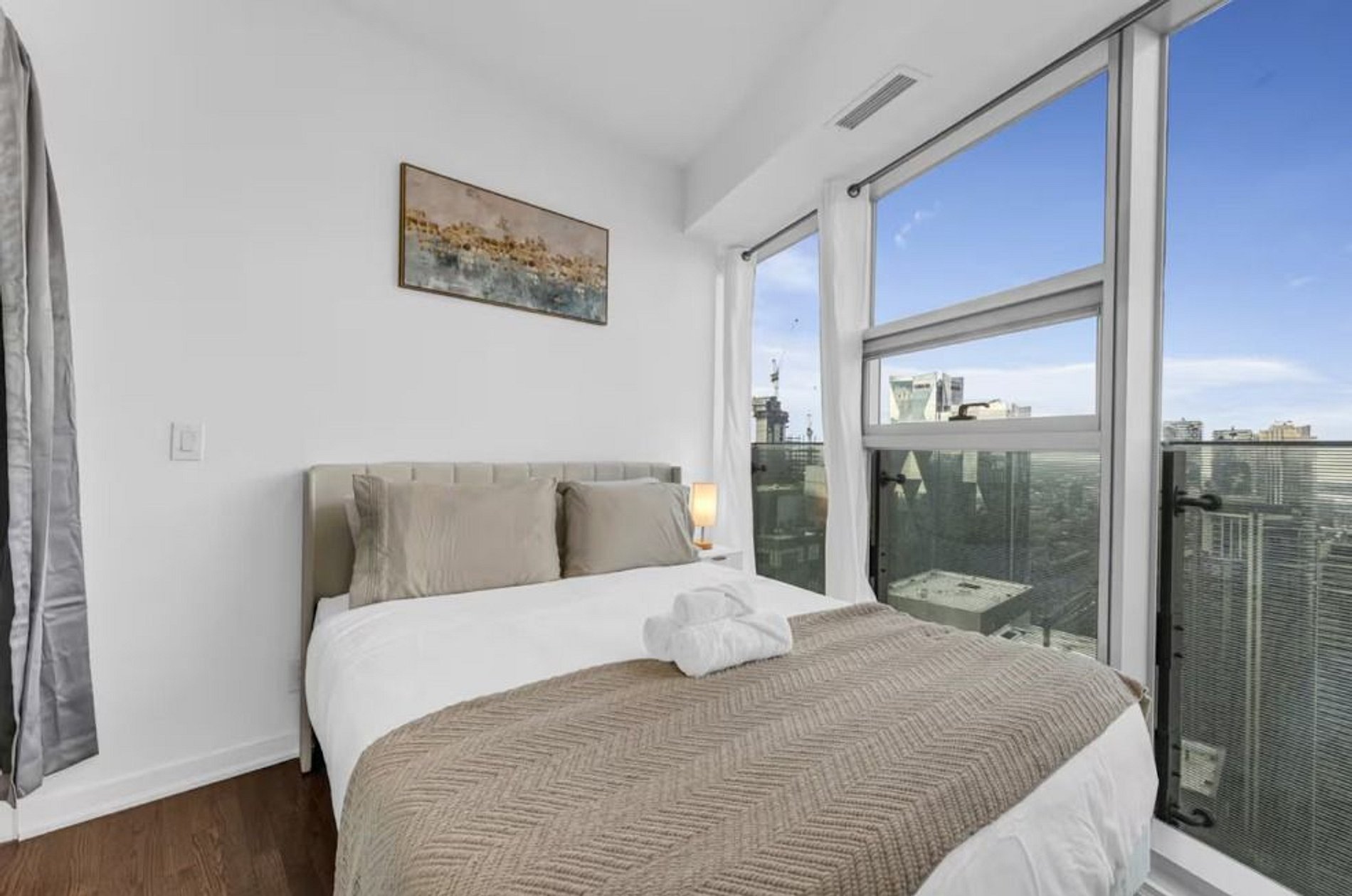 The entire condo includes: - Natural lighting in all parts of the condo with CN Tower, city and lake views - Catch beautiful sunset moments of the city in a large, spacious balcony - Fully stocked kitchen with a new coffee maker, on us! - Toaster, blender, microwave and all kitchen essentials for fun and seamless cooking nights - Spacious living room with a large pull-out couch, best for your group to relax and wind down - 3 bedrooms, surrounded with large windows - 2 full bathrooms with clean towels and toiletries - Premium memory foam three queen beds - Sofa bed perfect to sleep comfortably in and air mattress is included for extra bedding - Smart TV available for your own convenience - Unlimited high-speed internet - Washer and dryer included in main closet