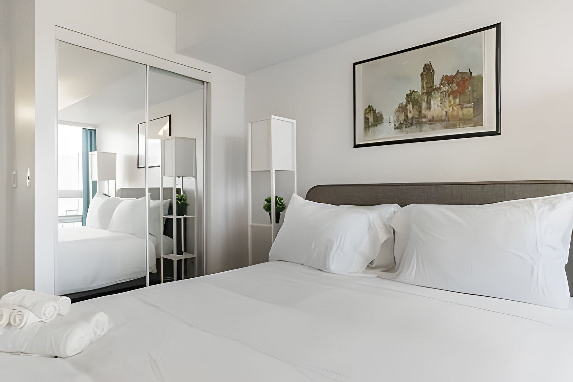 Master bedroom with a queen size bed (firm mattress) and ensuite bathroom for privacy, second bedroom with a double bed (firm mattress) and a separate full bathroom . Also , separate workspace area to do your work and attend meetings . Fully stocked kitchen, ensuite washer and dryer , SMART TV, 1GBPS high speed WIFI , private balcony with lake & city views and everything required to make this your home away from home.