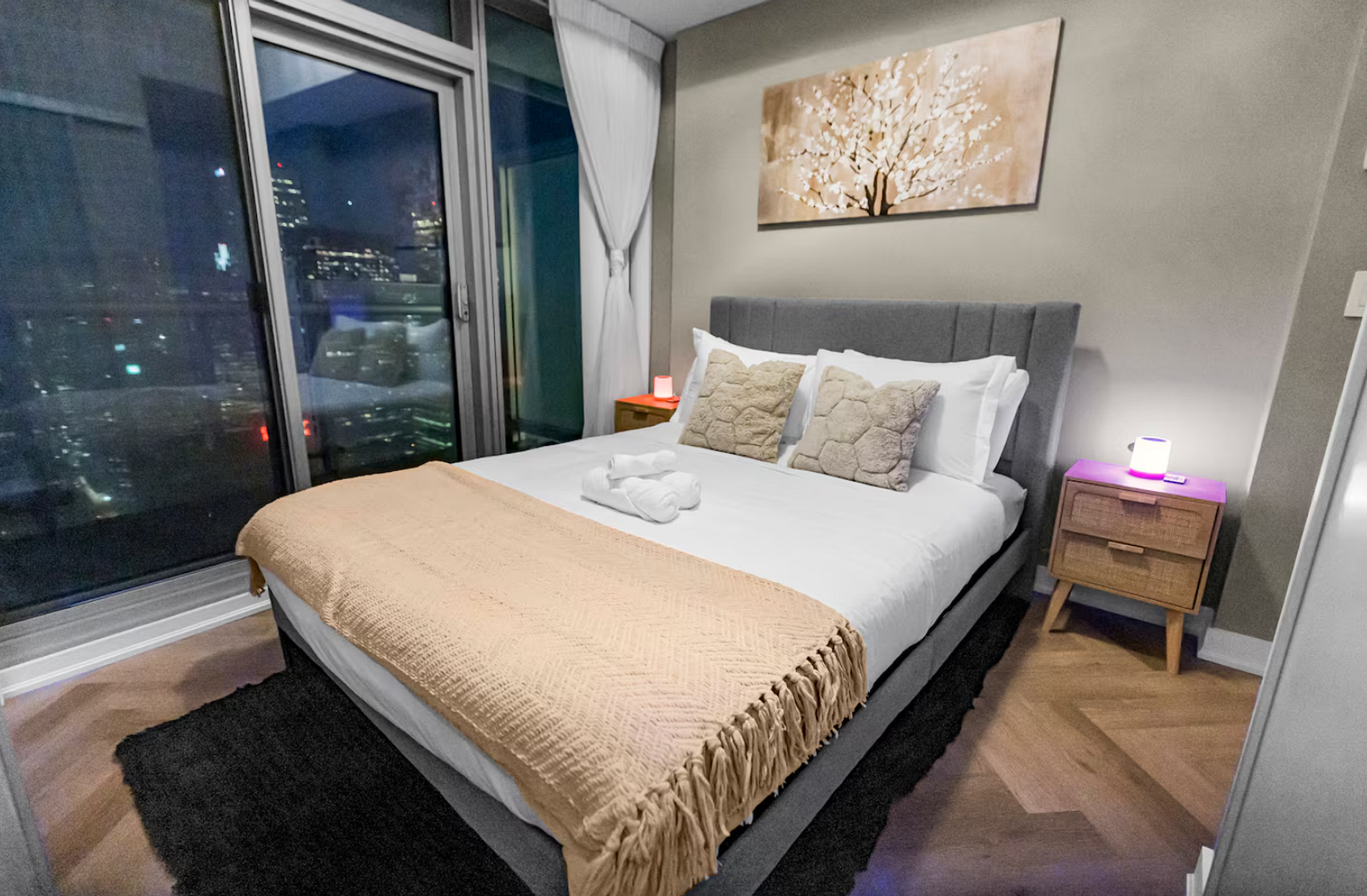 Enjoy a stylish experience at this centrally located place. This 2-bedroom, 2-bathroom unit is located in the heart of the city within walking distance to many of Toronto's most popular tourist destinations. Steps away from the Budweiser stage, minutes from Scotiabank Arena and CN Tower, Rogers Centre, Ripley' s Aquarium and much more. Master bedroom with queen size bed, second bedroom full size bed. Stocked kitchen, SMART TV, WIFI.