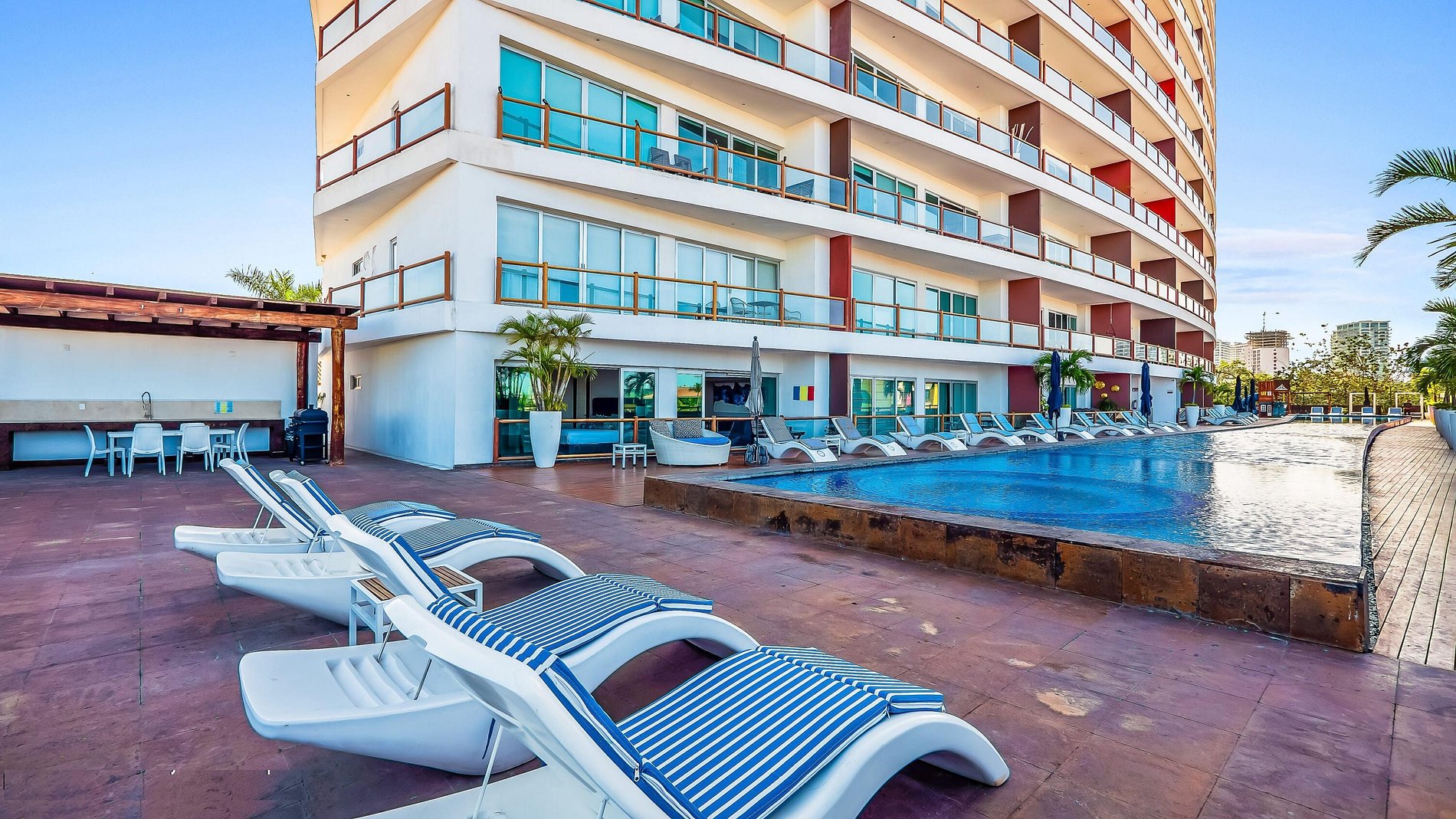 Terraza y zonas de descanso: Amplias zonas comunes con tumbonas y zonas a la sombra para relajarse, leer o disfrutar de cócteles.