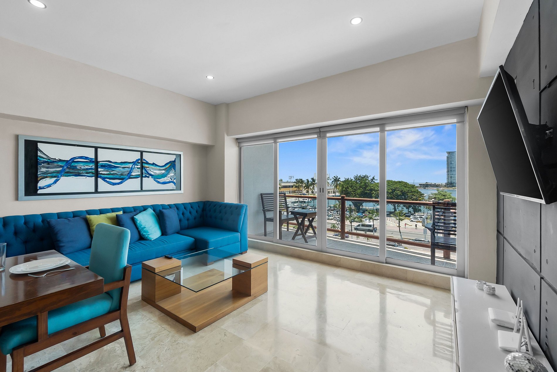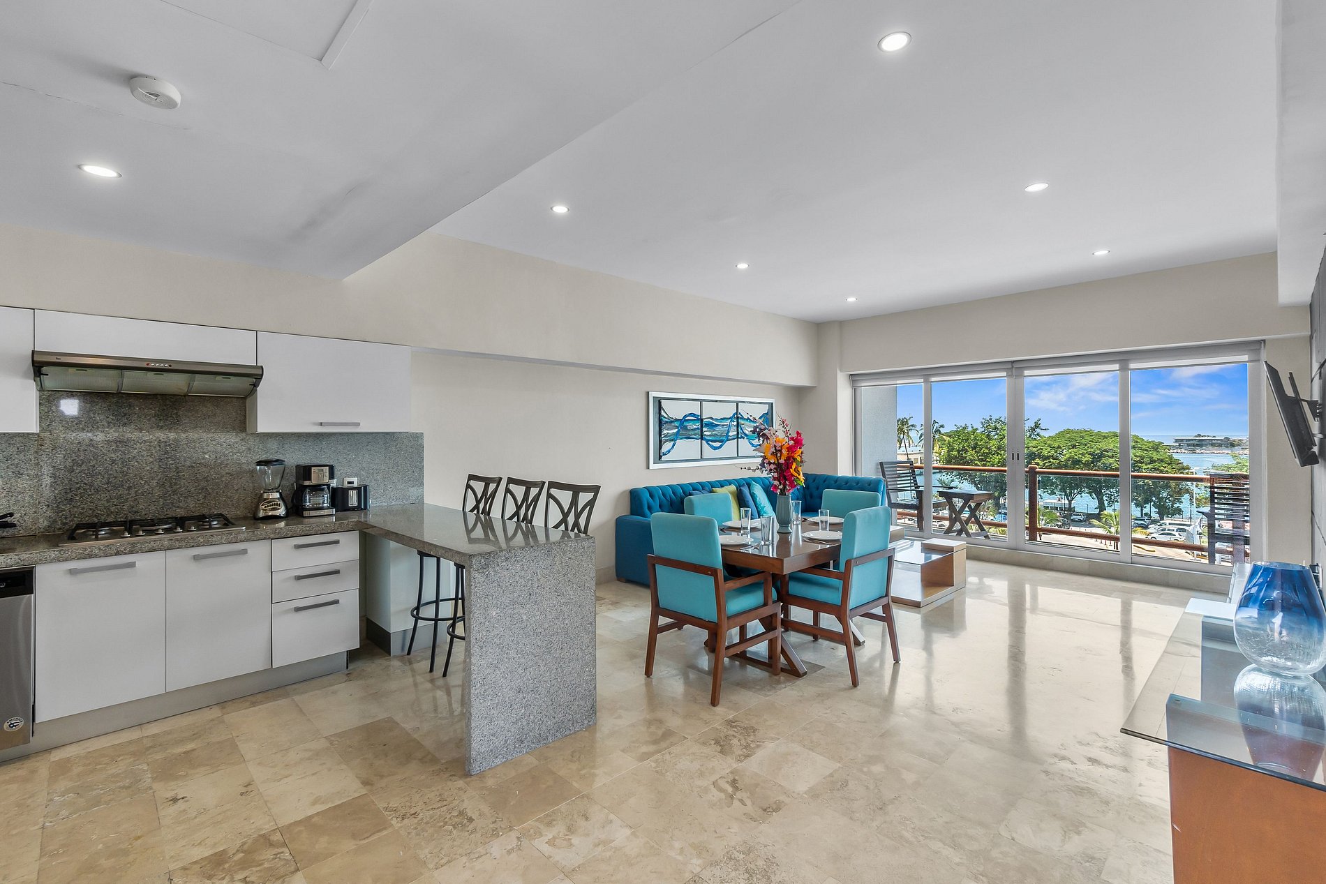 Disfrute de la vida junto a la playa en este elegante apto de 1 dormitorio y 1,5 baños en Deck12, a solo 3 min de la arena en la zona hotelera de Puerto Vallarta. Perfecto para familias, con capacidad para 8 personas, con una cama king size y 3 sofás cama dobles.