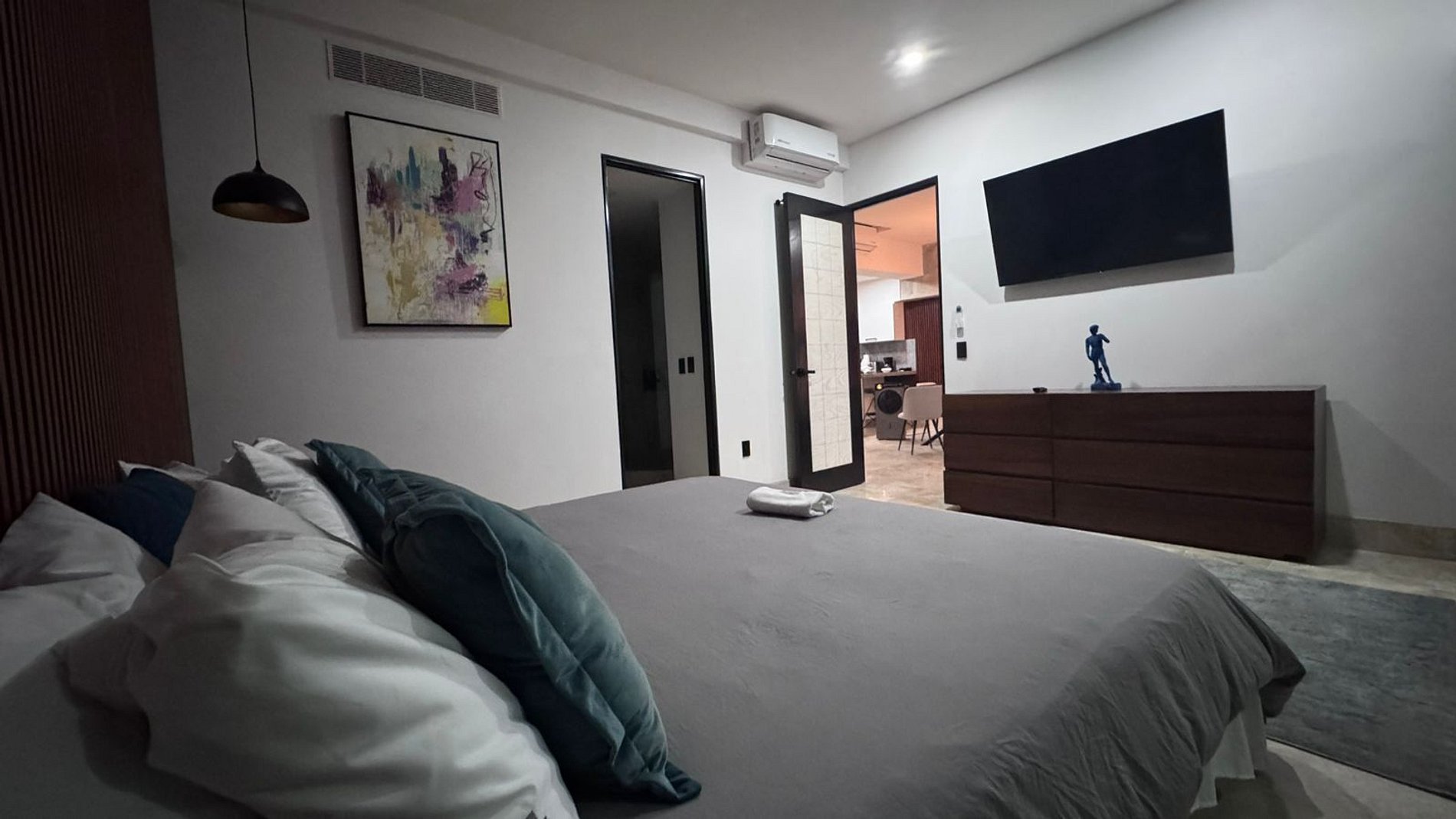 Cuenta con todo lo necesario para una estancia cómoda y placentera: cocina completamente equipada, aire acondicionado, blancos de calidad, centro de lavado, elevador, estacionamiento privado, amplia alberca, y gimnasio.
